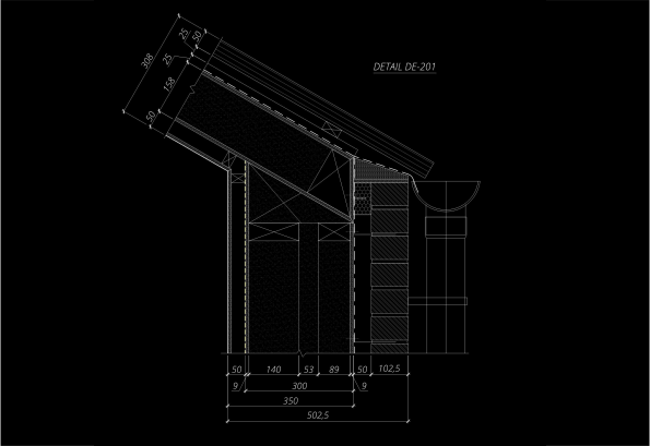 Architectural technical drawing with detailed measurements of a roof structure, labeled Detail DE-201.