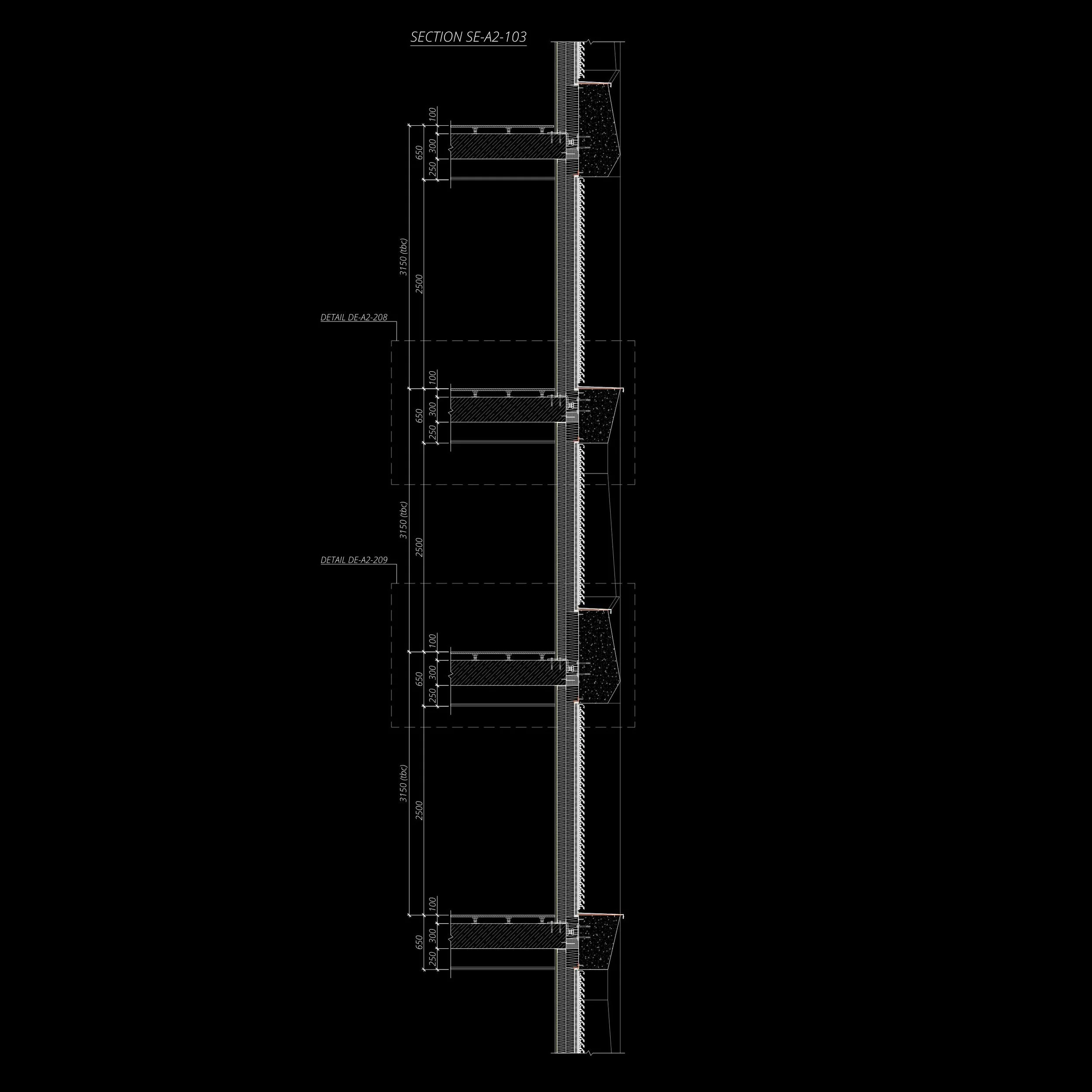 Architectural section drawing showing building wall detail with dimensions and material layers labeled, including insulation and structural components. Section marked SE-A2-103.