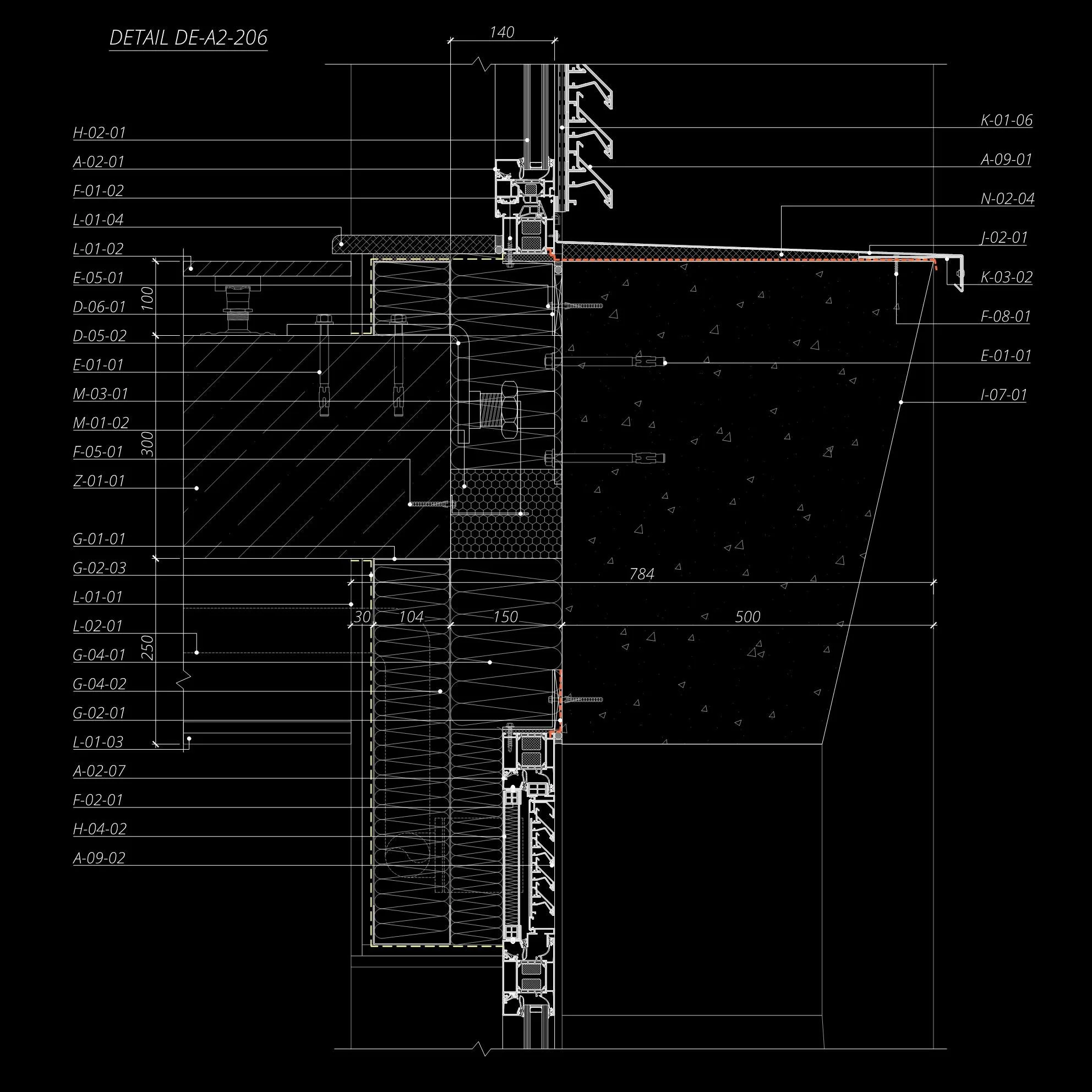 Architectural detail drawing of a building section labeled DE-A2-206. Includes measurements, annotations, layers, and components like insulation and structural elements in a side view.