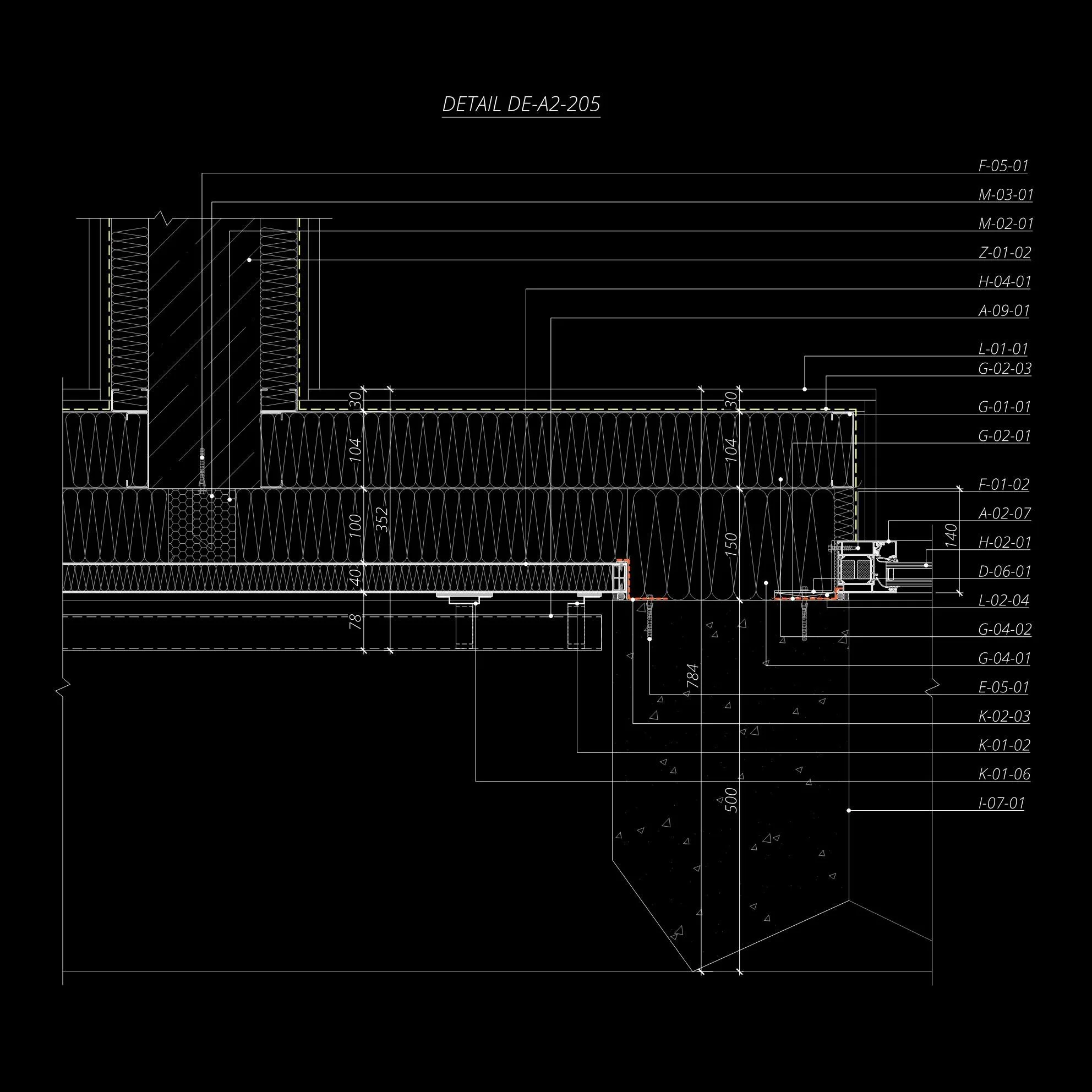 Architectural technical drawing labeled "DETAIL DE-A2-203" with measurements and component markings such as A-02-01, F-01-02, and G-02-01, on a black background.