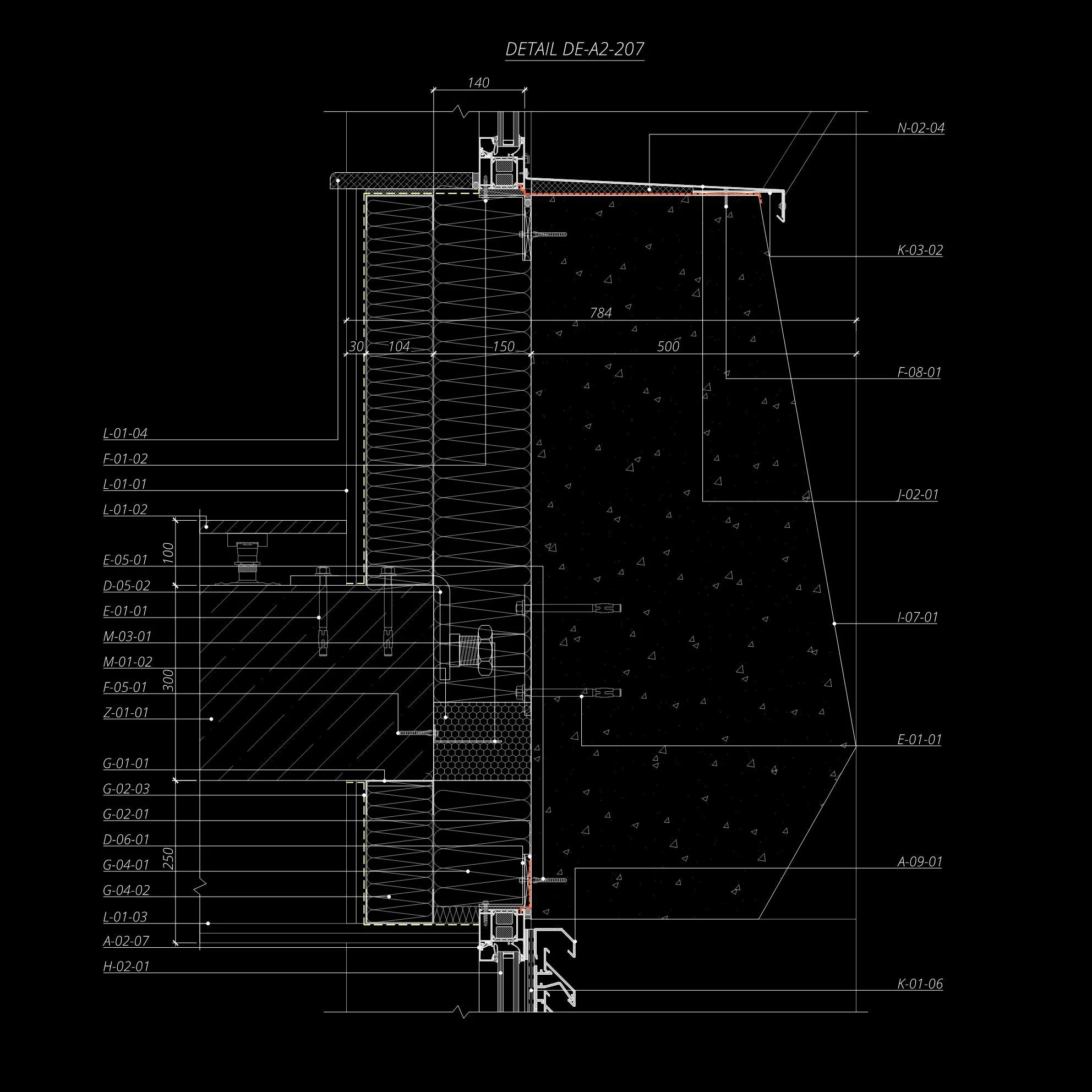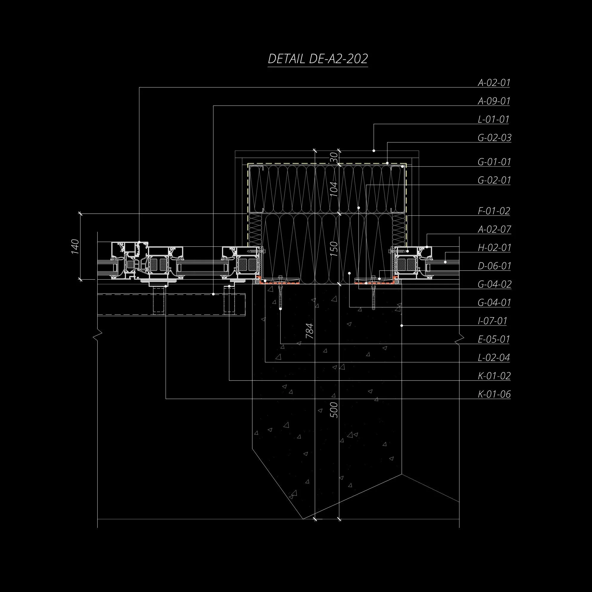 Architectural technical drawing with detailed section labeled DE-A2-202, showing dimensions and component labels for a structural element.