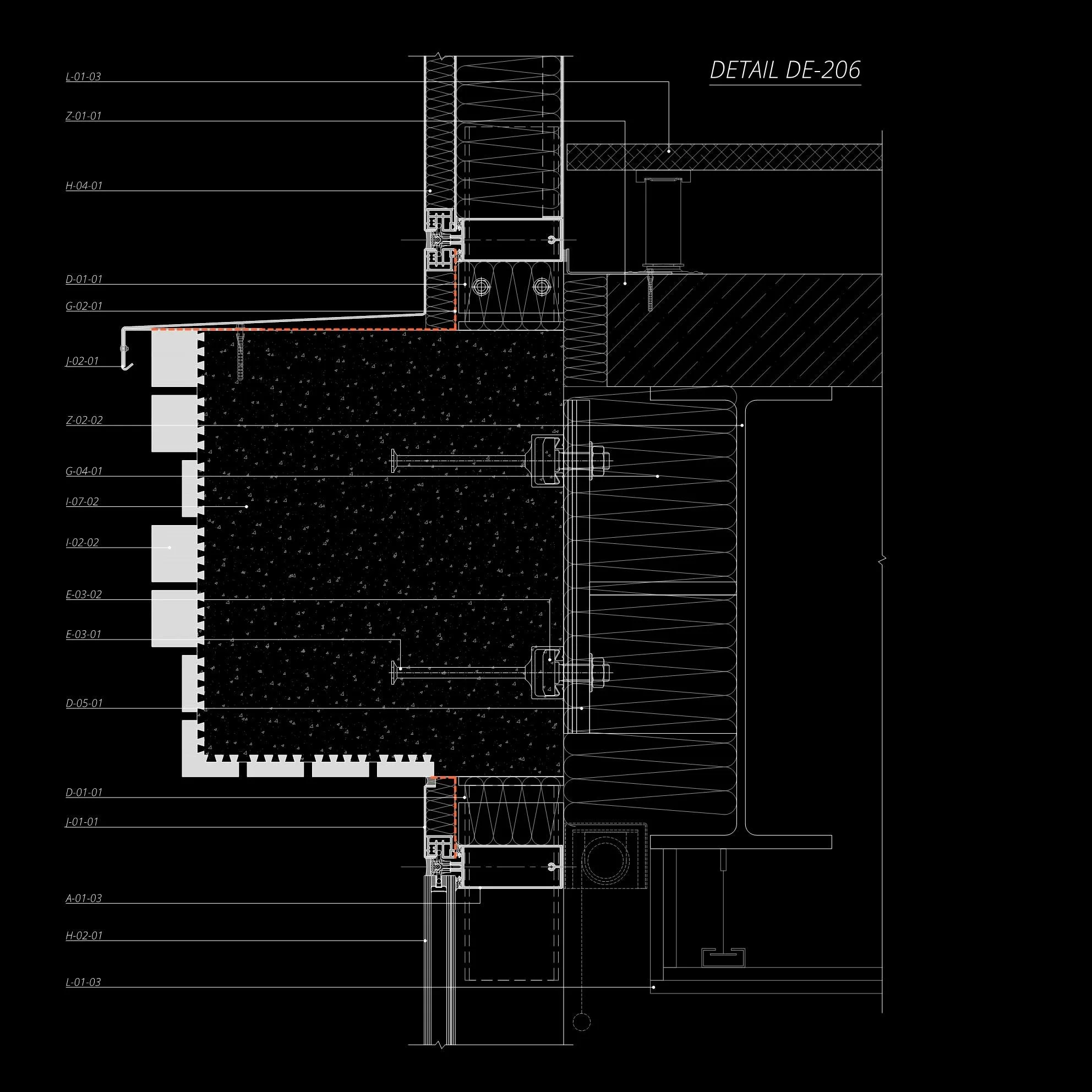 Technical architectural drawing of detail DE-204, showing a cross-sectional view with multiple labeled components such as Z-02-01 and L01-01, featuring structural and mechanical elements.