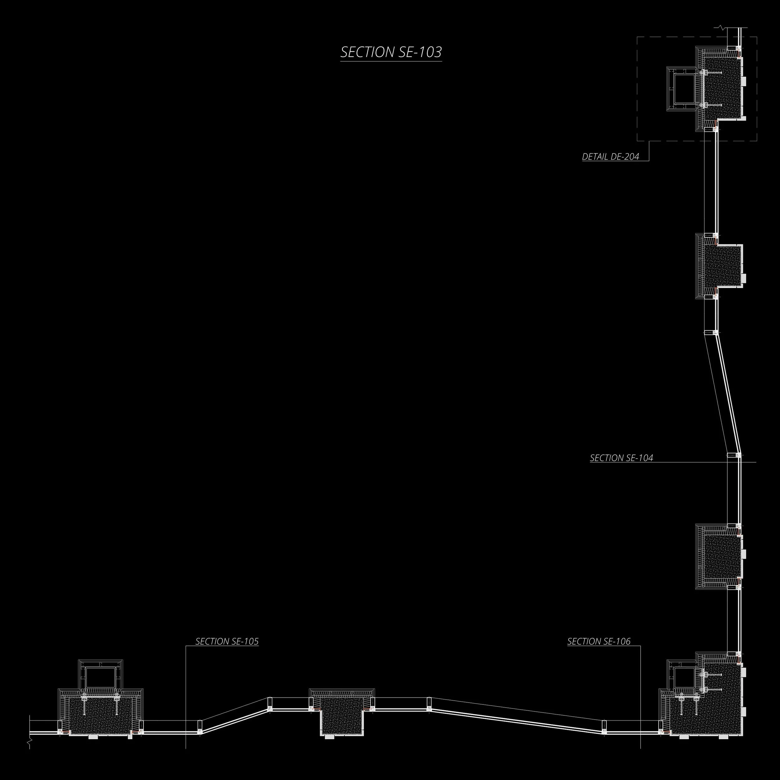 Technical drawing of an architectural section labeled SE-103, showing various structural details and sections SE-104, SE-105, and SE-106. Includes Detail DE-204.