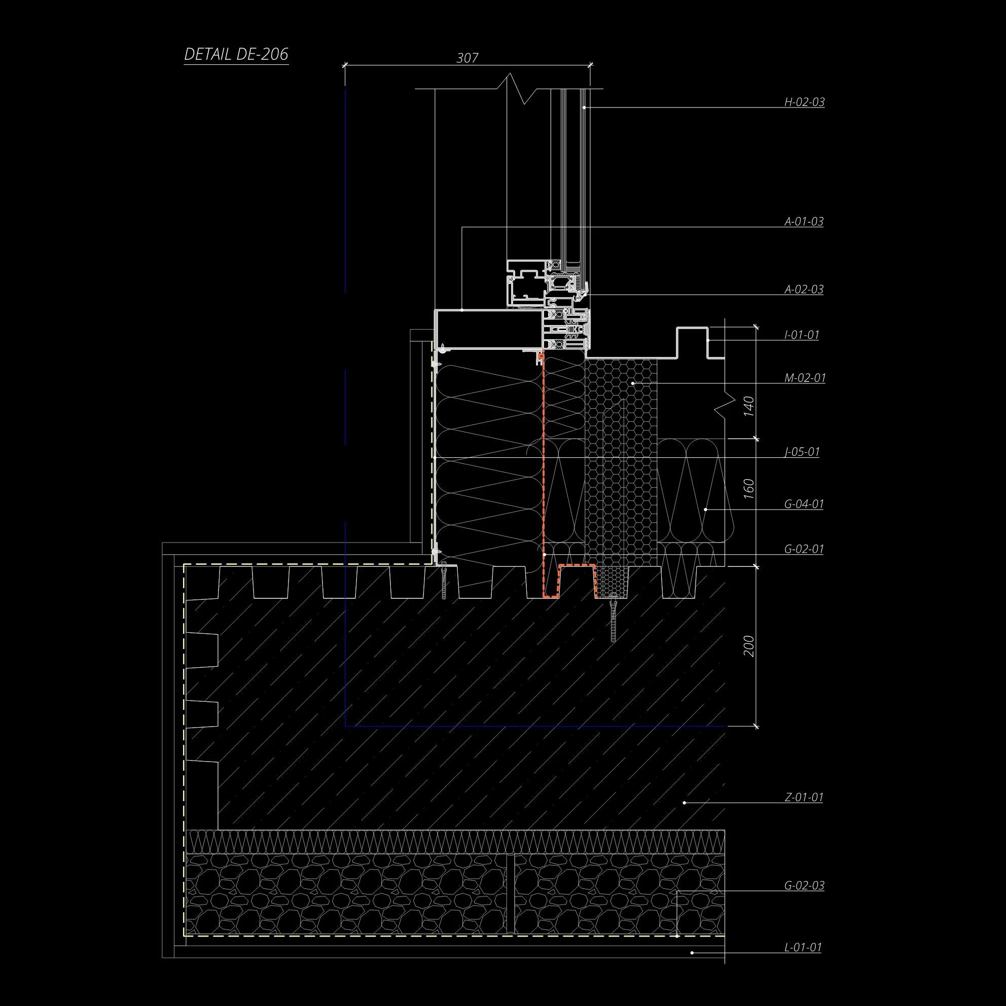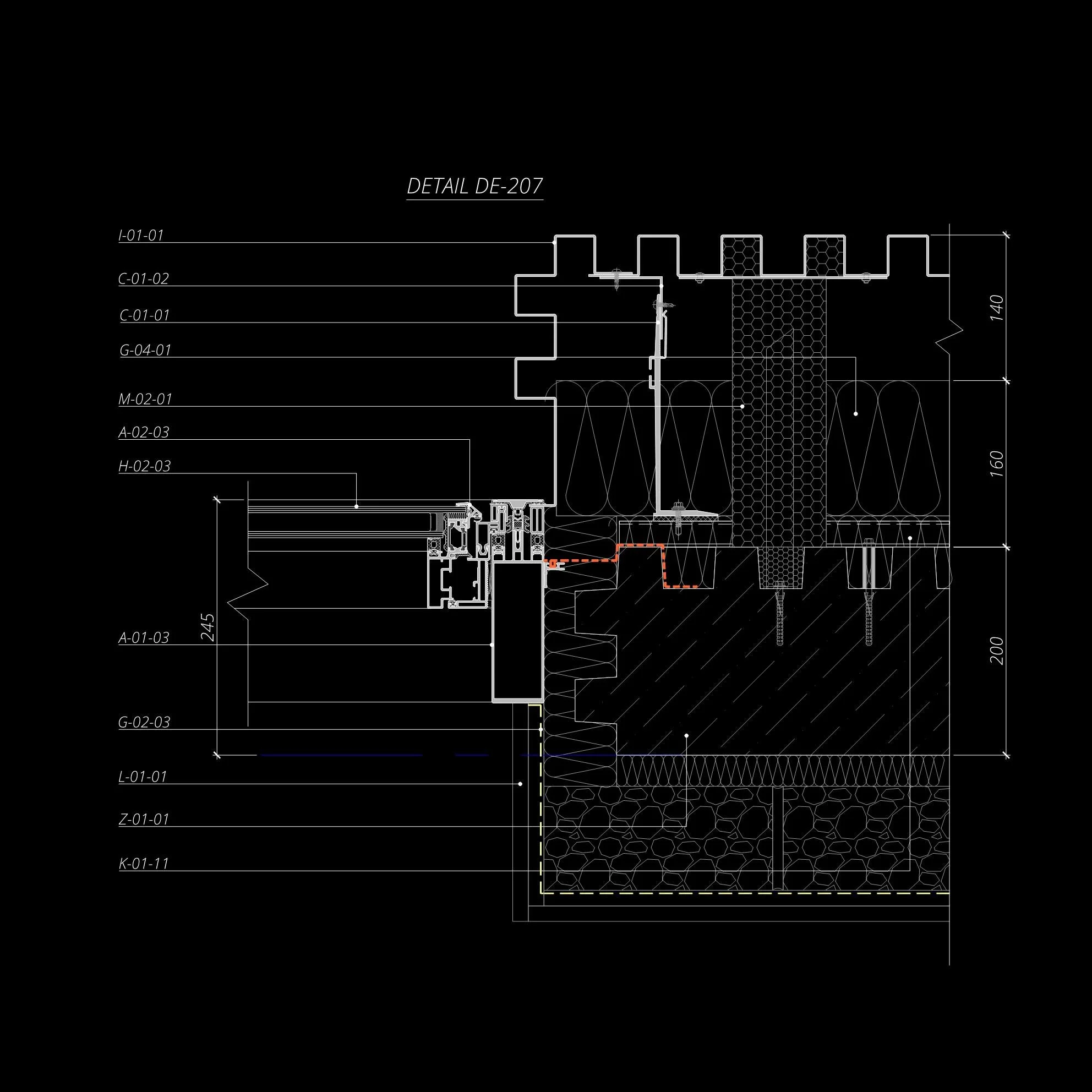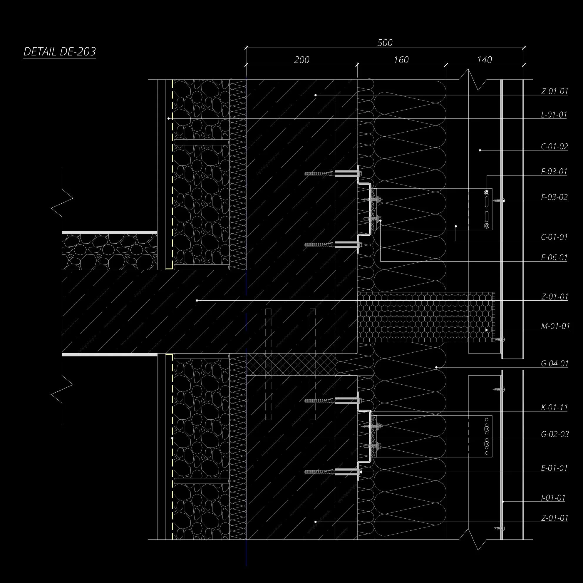 Architectural detail drawing DE-201, showcasing a cross-section of wall construction with measurements and component labels, highlighting insulation, structural elements, and cladding details on a black background.