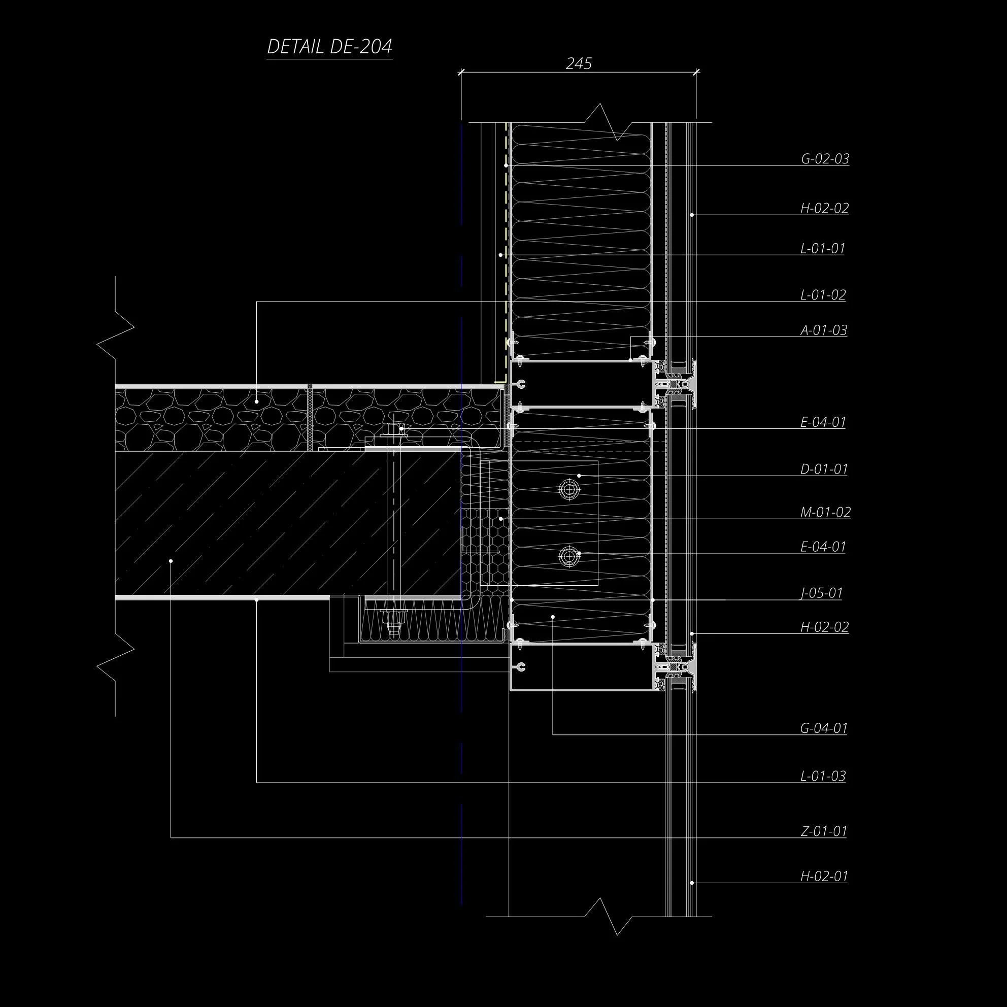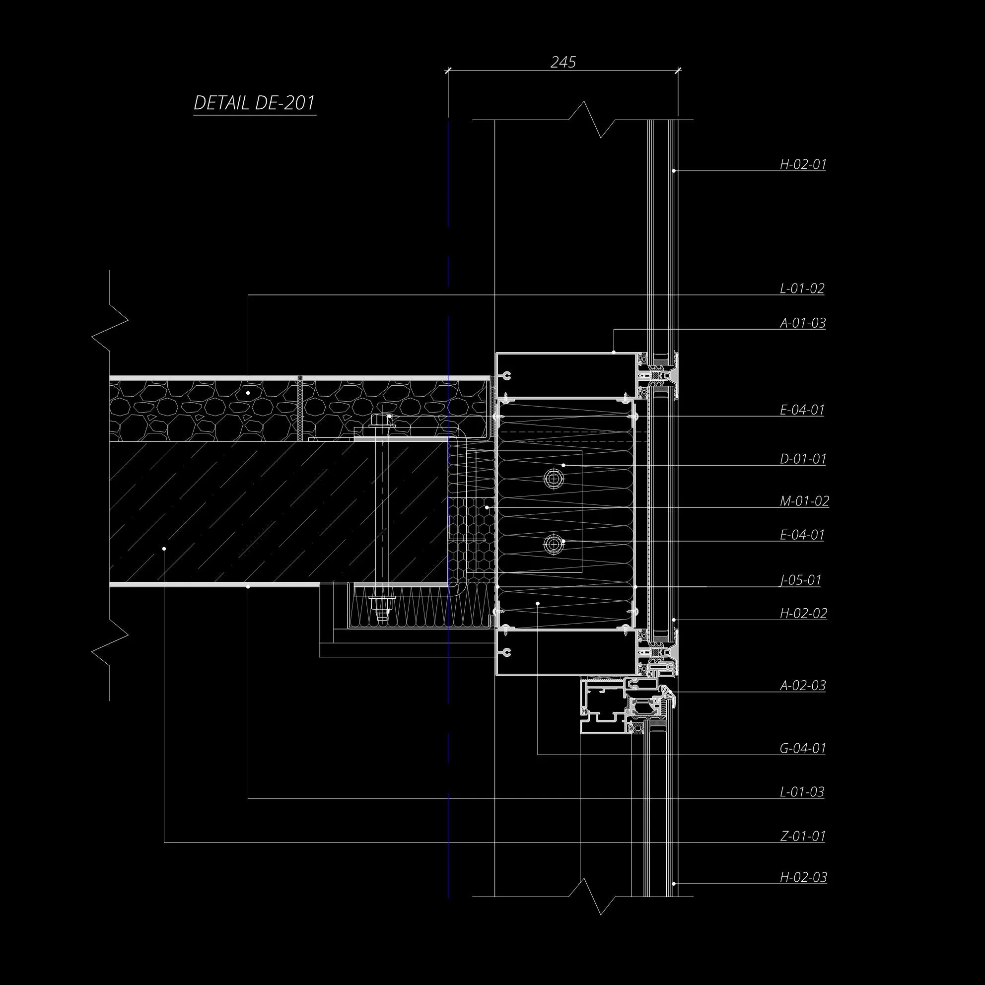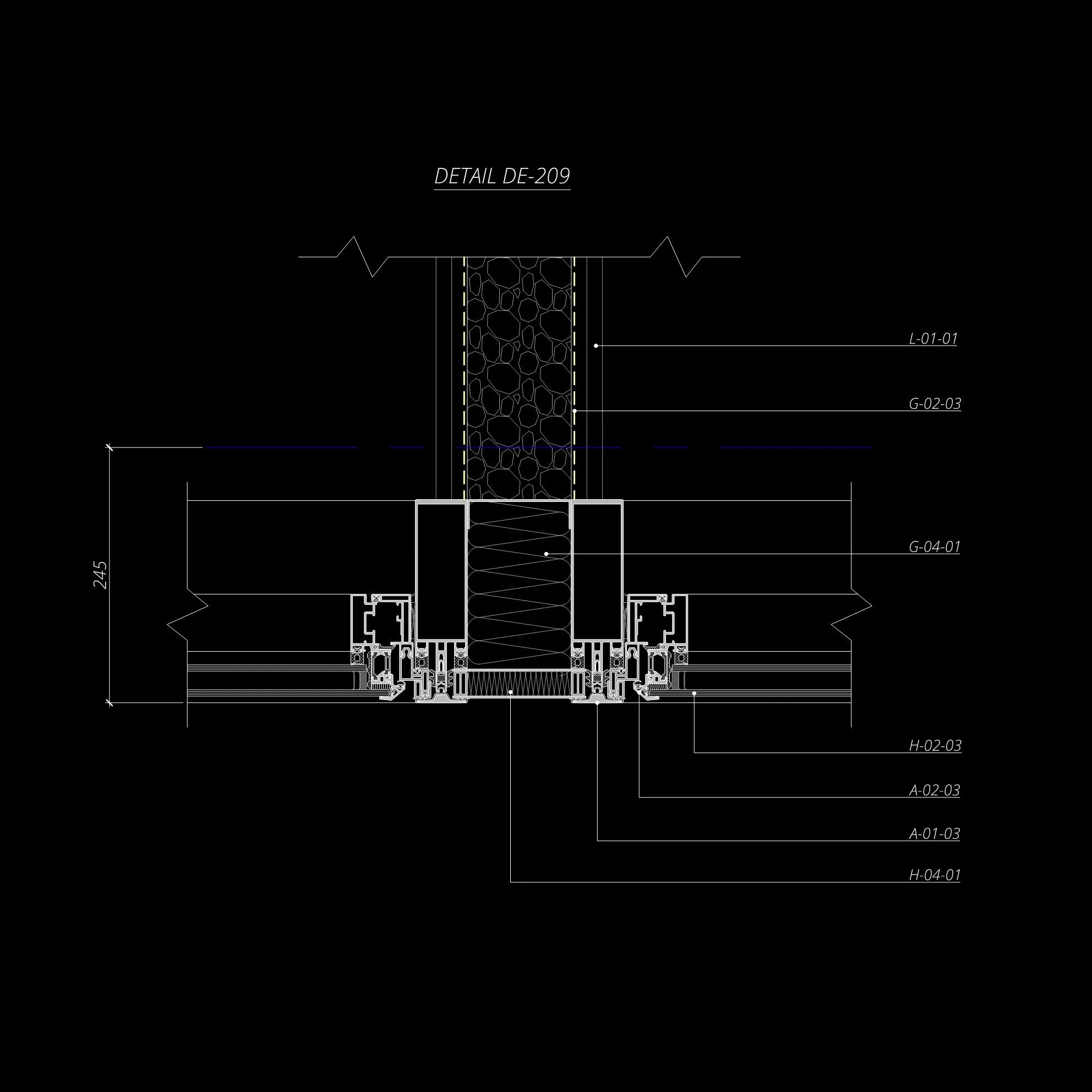 Technical drawing detail DE-208 showing architectural section with dimensions 245 units, labeled A-01-03 and H-02-01.