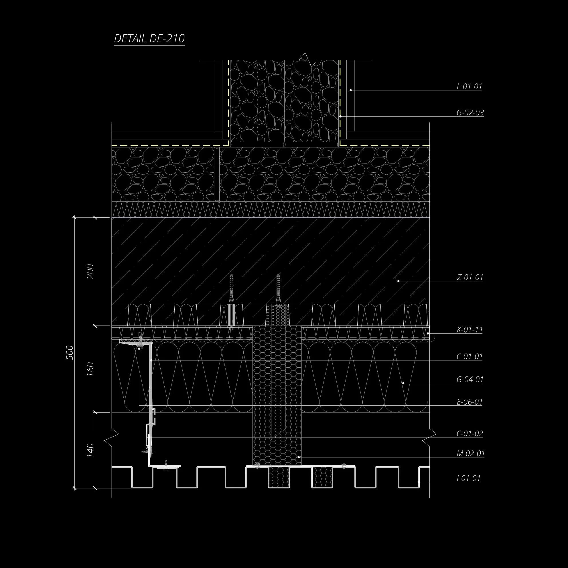 Technical cross-section drawing of construction detail DE-210 with measurements and labels indicating layers and materials used in building design.