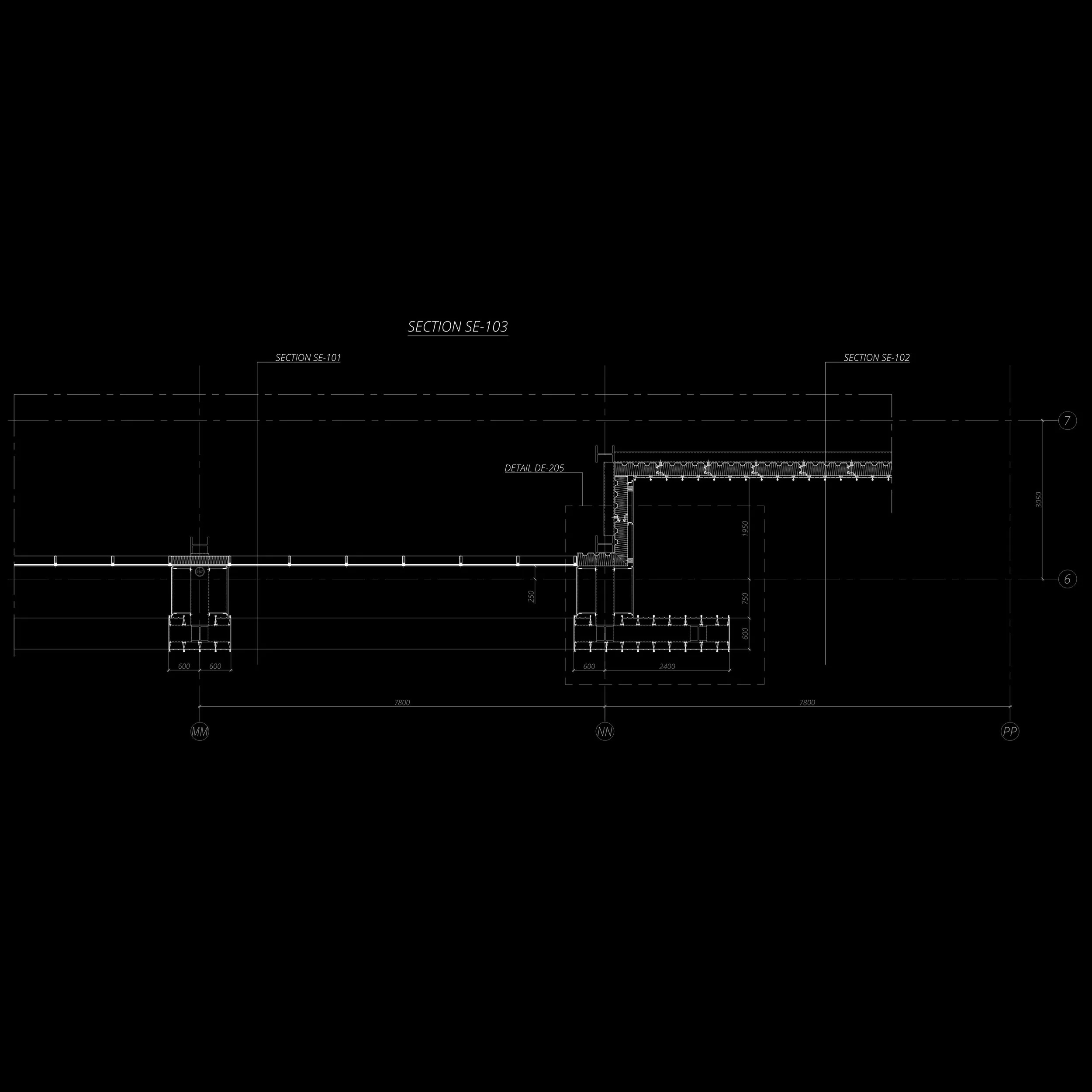 Architectural blueprint showing detailed section diagrams with labels "Section SE-102" and "Section SE-103," including measurements and structural elements, on a black background.