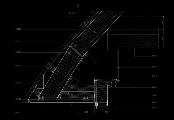 Architectural technical drawing of a building section with measurements and details labeled; includes angled lines and structural elements visible.
