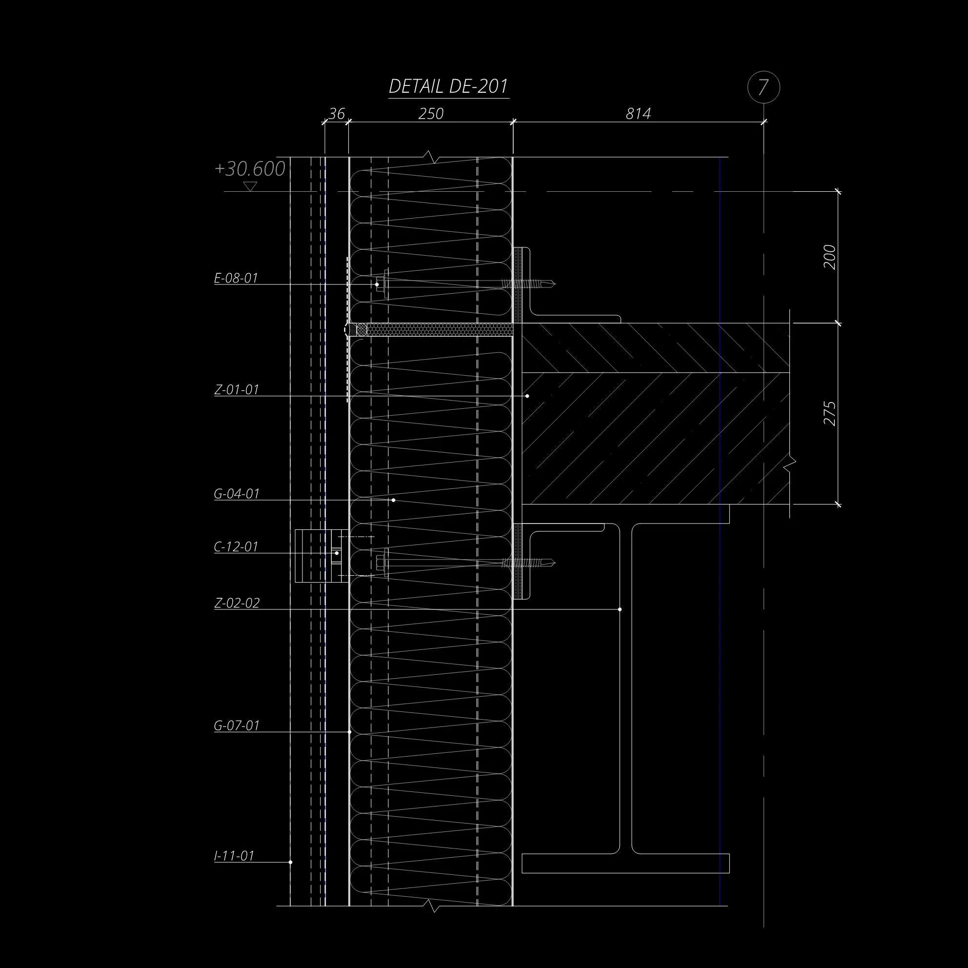 Architectural technical drawing of a wall section, labeled 'Detail DE-201', showing dimensions and construction details such as insulation layers, structural elements, and fasteners. Measurements and annotations are visible on a black background, with lines and symbols indicating specific components.