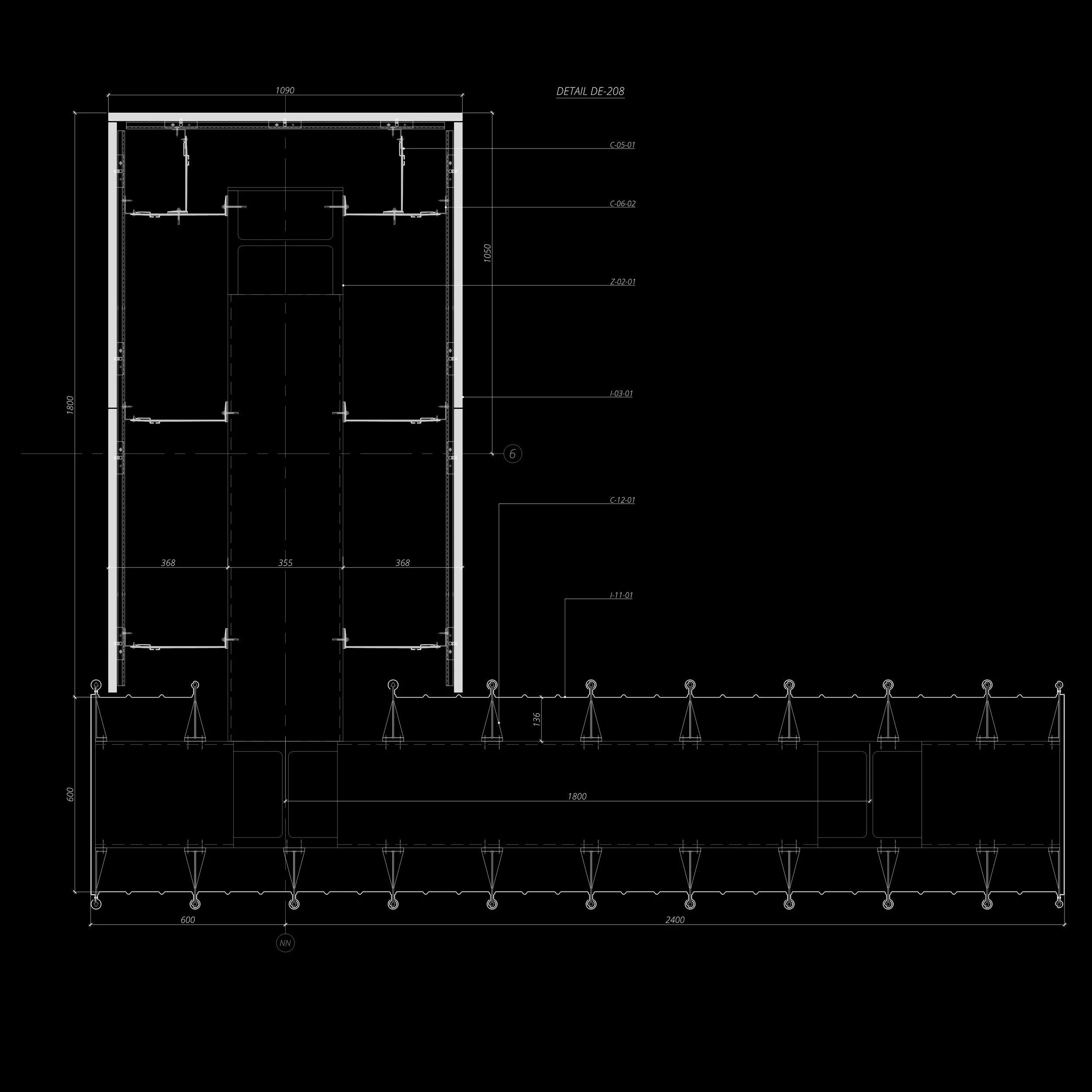 Technical drawing labeled "Detail DE-209" showing structural dimensions and sections marked A-01-02, H-02-01, and Z-02-01. Includes measurements of 500, 575, and 525 next to lines and symbols on a black background.