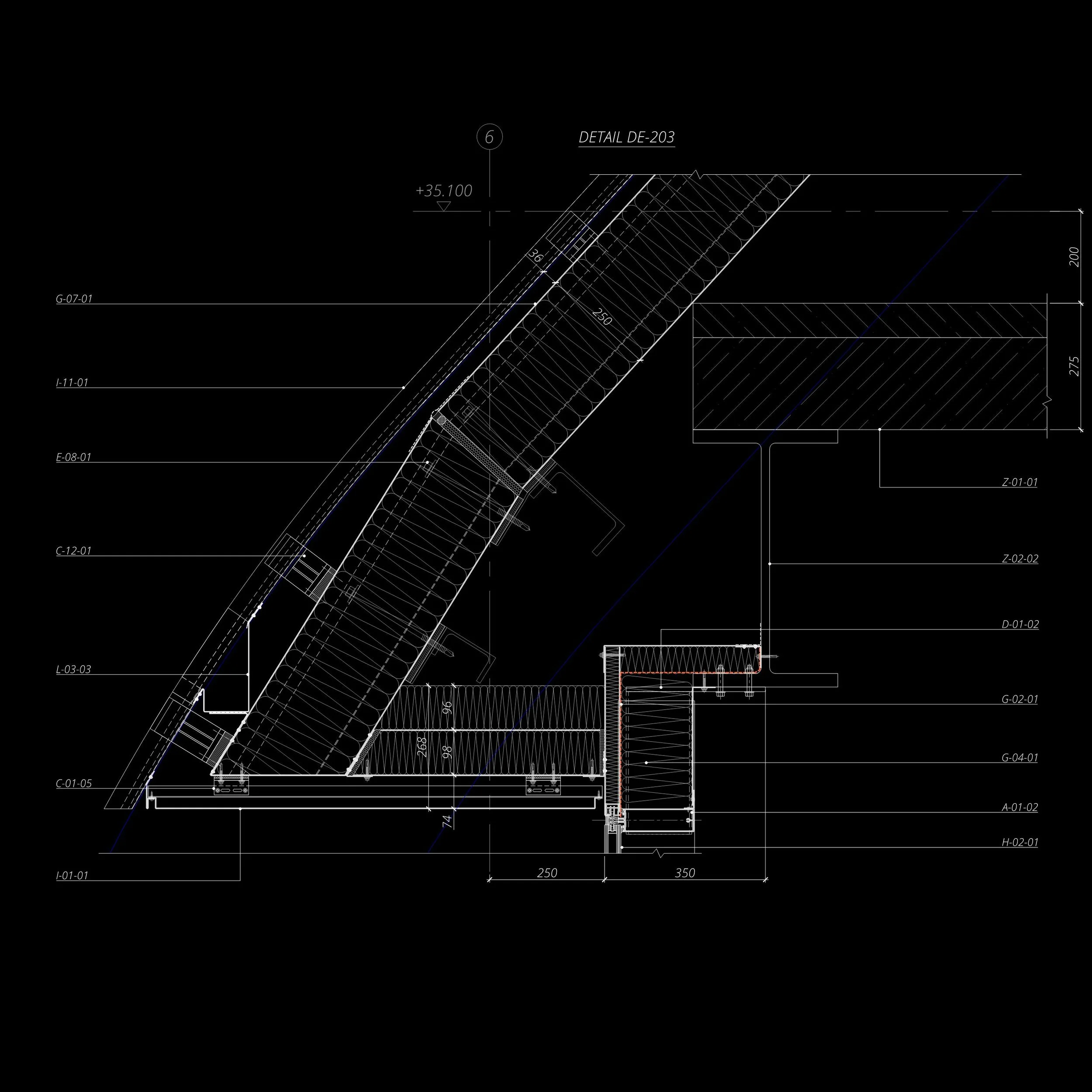 Architectural detail drawing with technical measurements and annotations labeled "Detail DE-202" showing structural and material specifications.