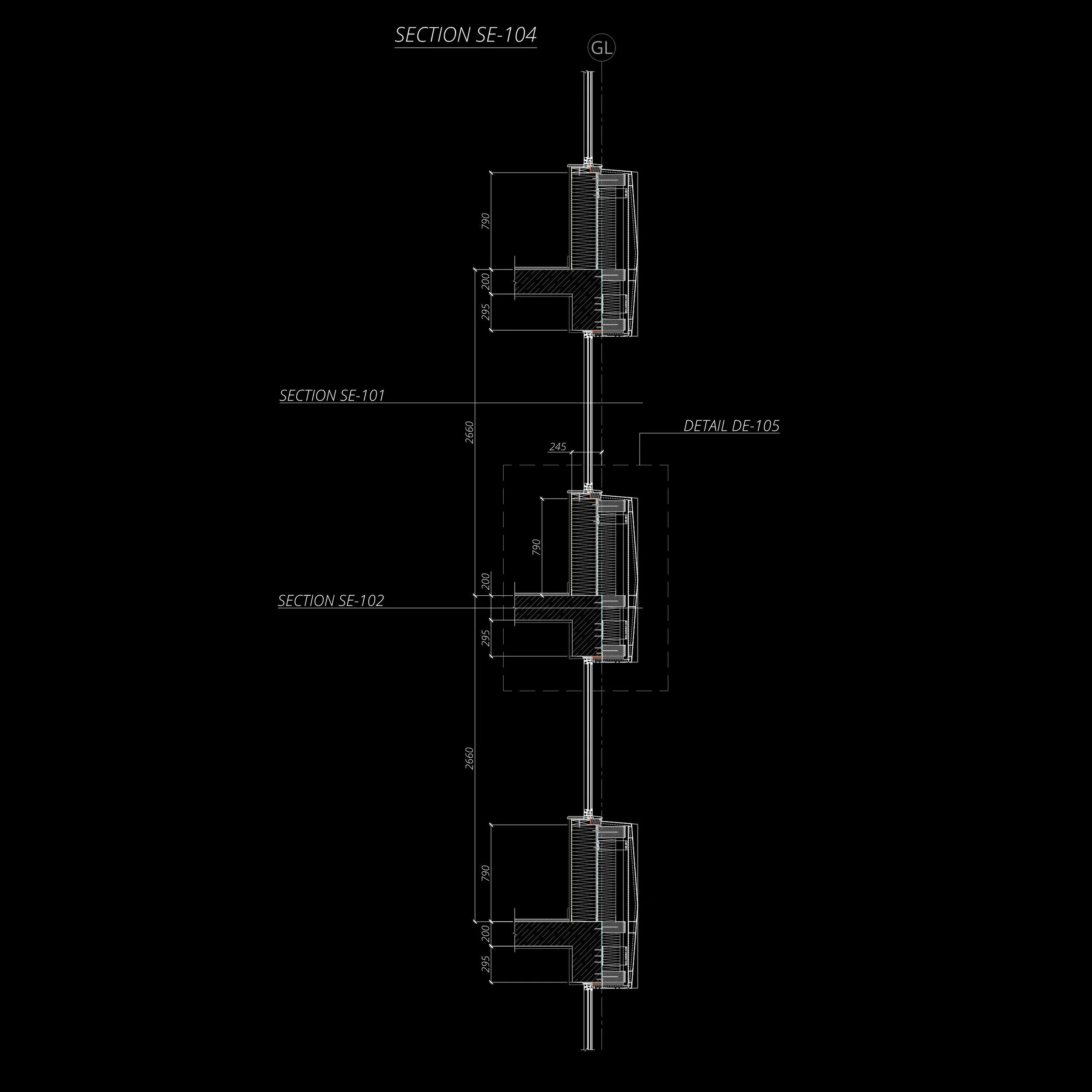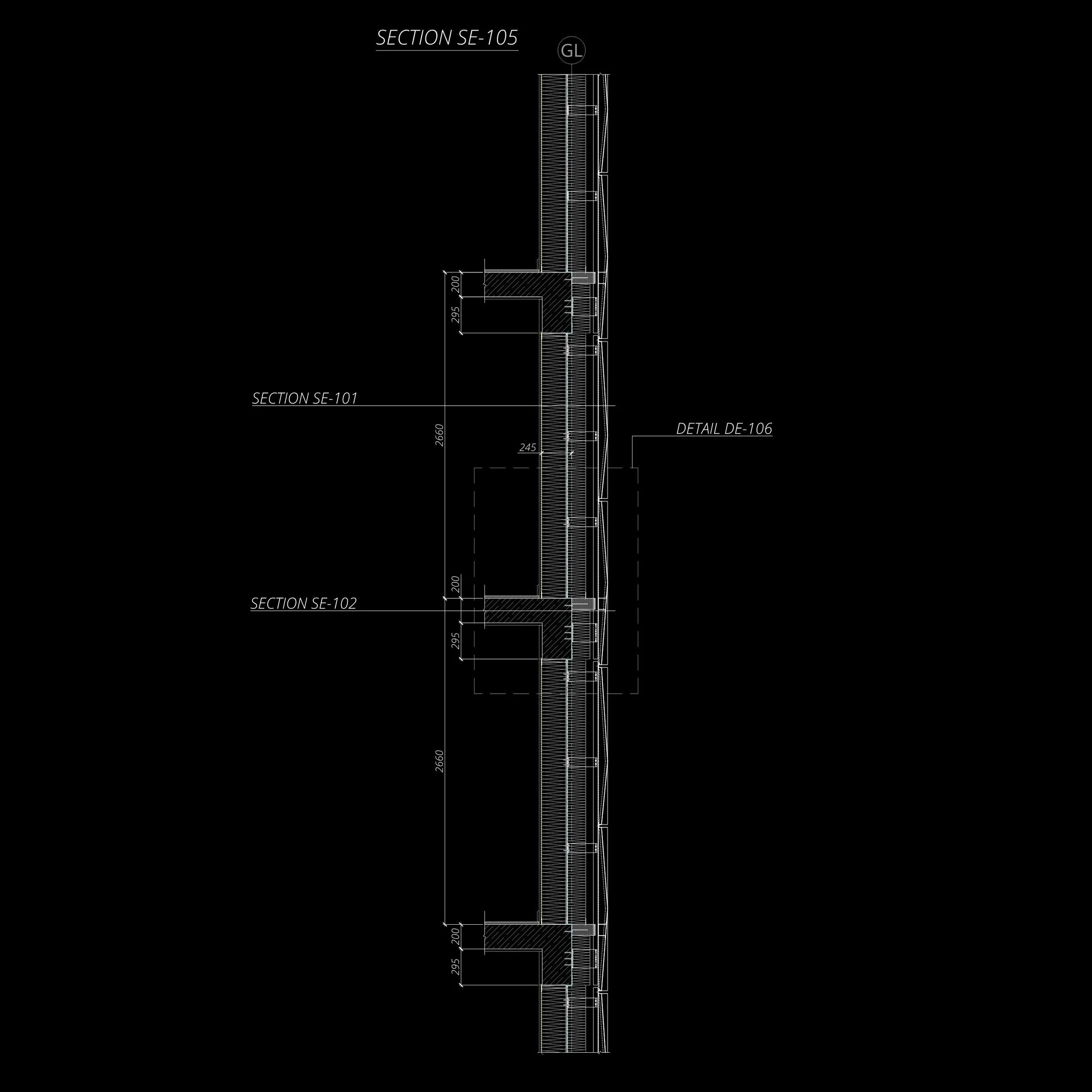 Architectural section drawing showing detailed measurements and sections labeled SE-104, SE-101, SE-102, and detail DE-105 on a black background.