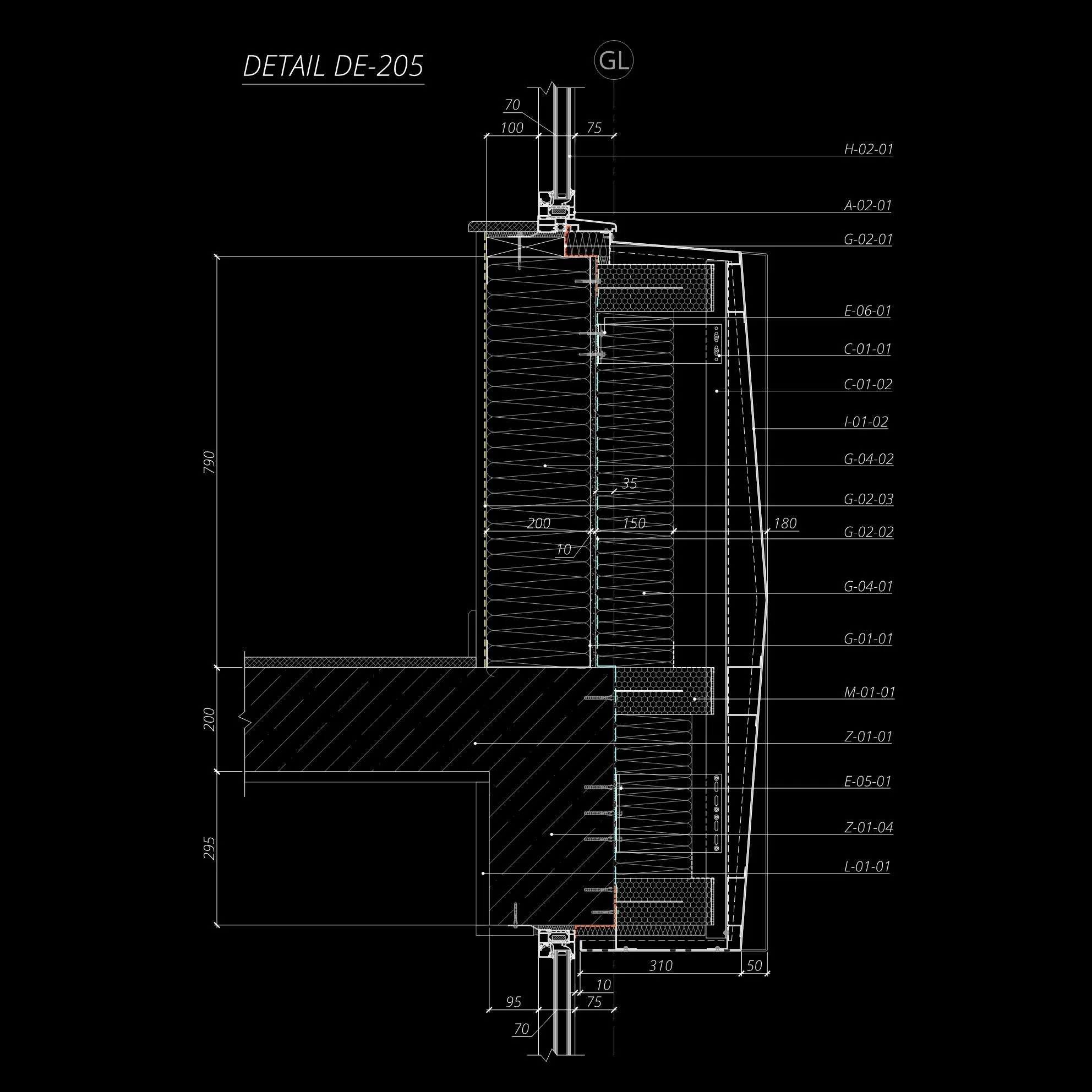 Architectural section detail labeled DE-206 with dimensions and material labels, showing layers of construction elements, indicated in white on a black background.