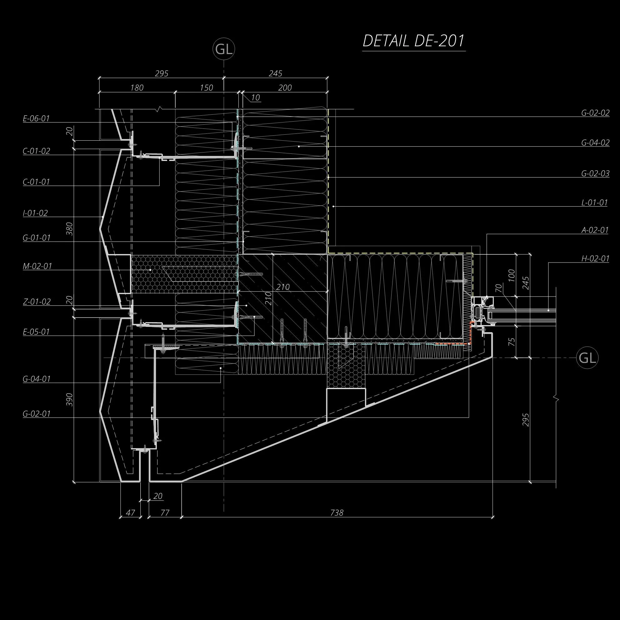 Architectural drawing showing construction details labeled "DETAIL DE-202" with measurements and technical specifications for a building feature.