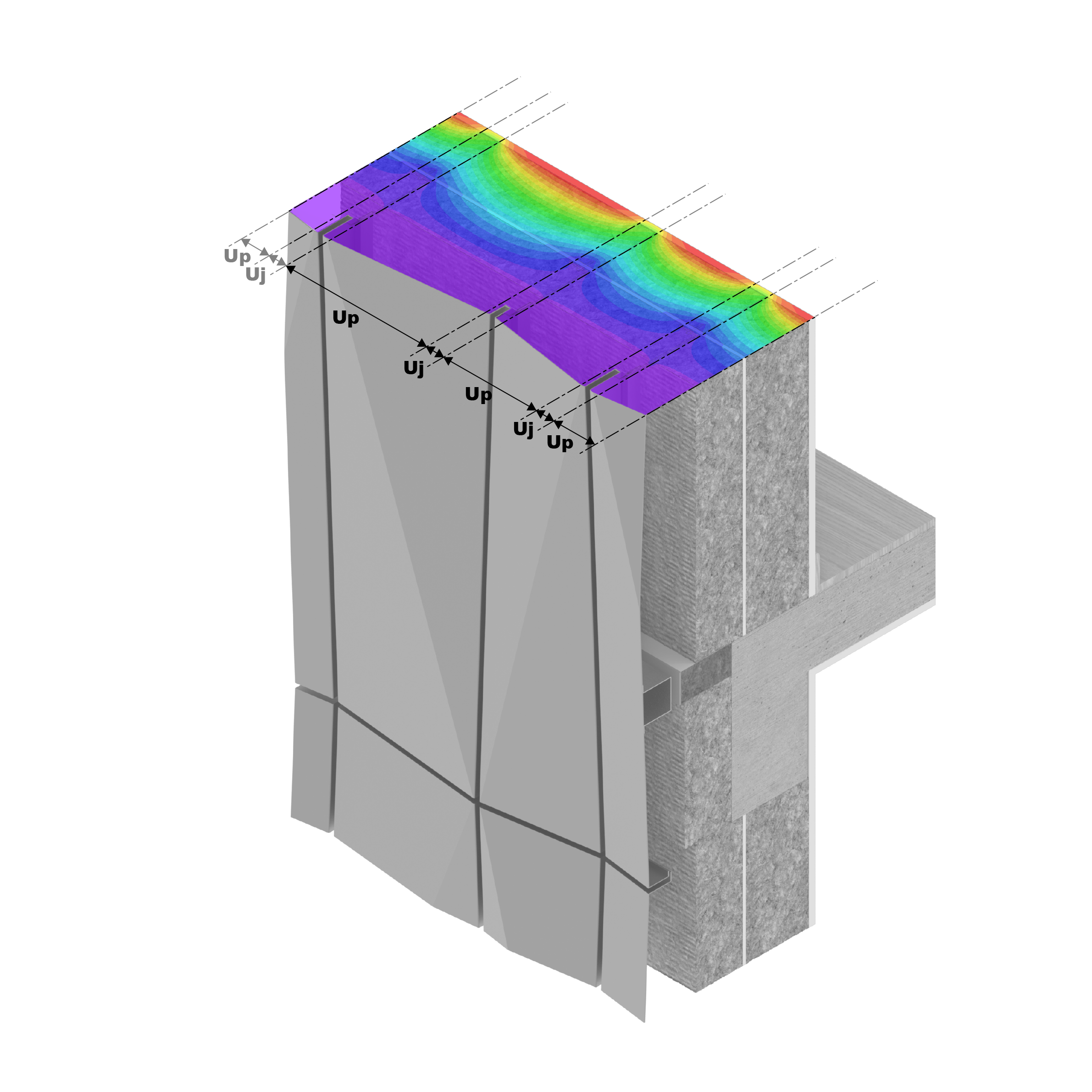 3D thermal analysis of a building wall with color gradient indicating temperature distribution.