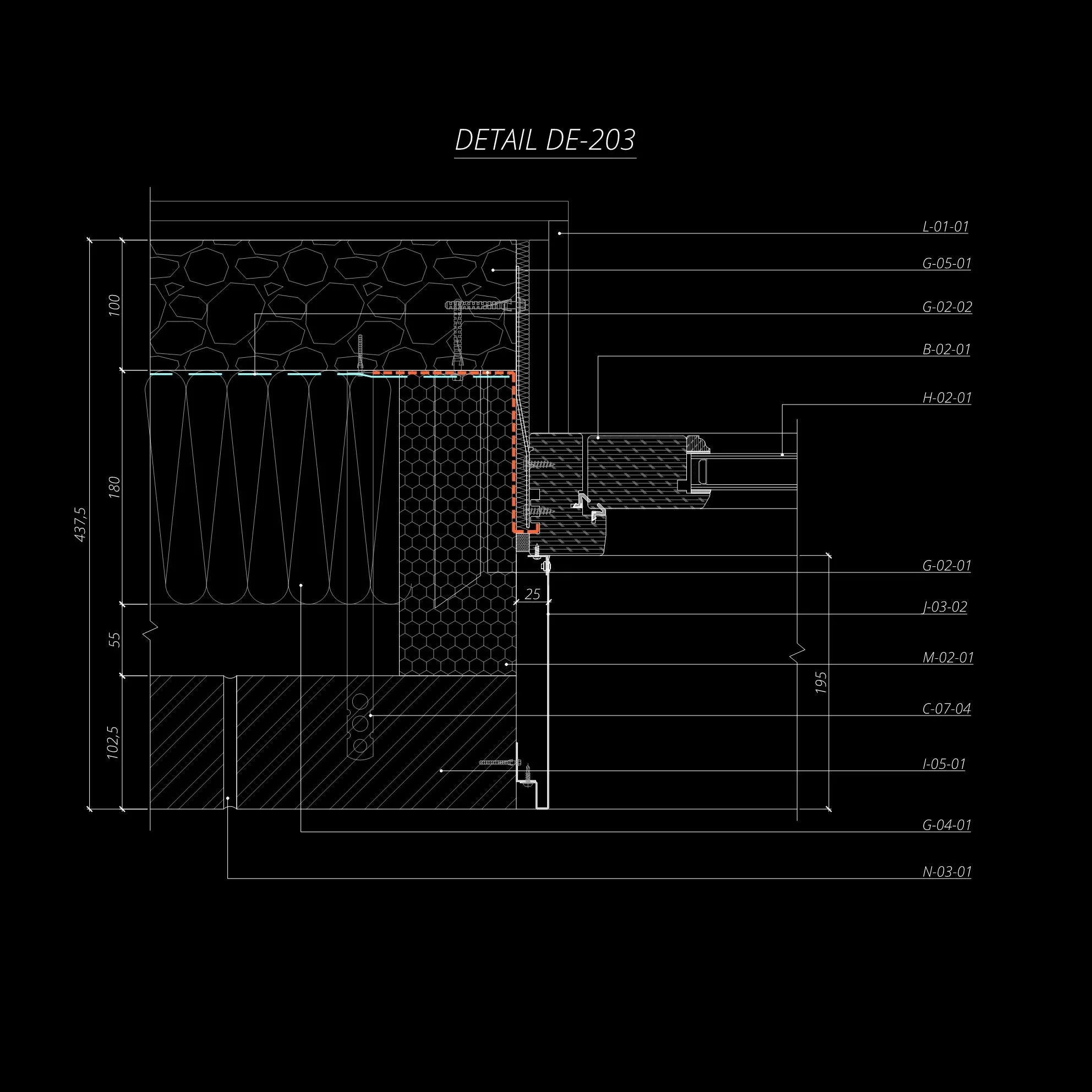 Architectural detail drawing labeled DE-202, showing complex layers and measurements with grid patterns and textured shading.