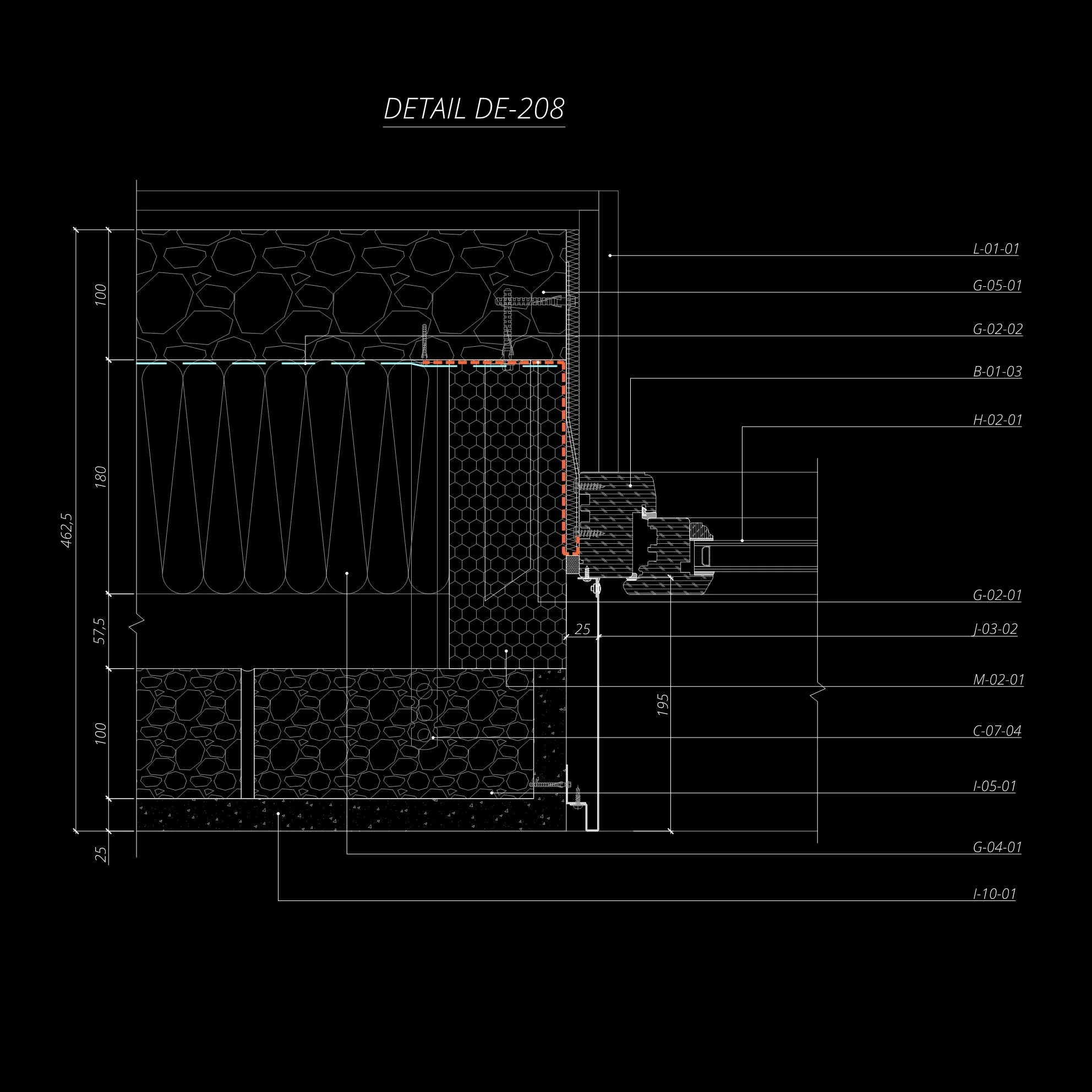 Technical architectural drawing labeled "Detail DE-208," featuring cross-section of structural components and layers, including dimensions and annotations, on a black background.