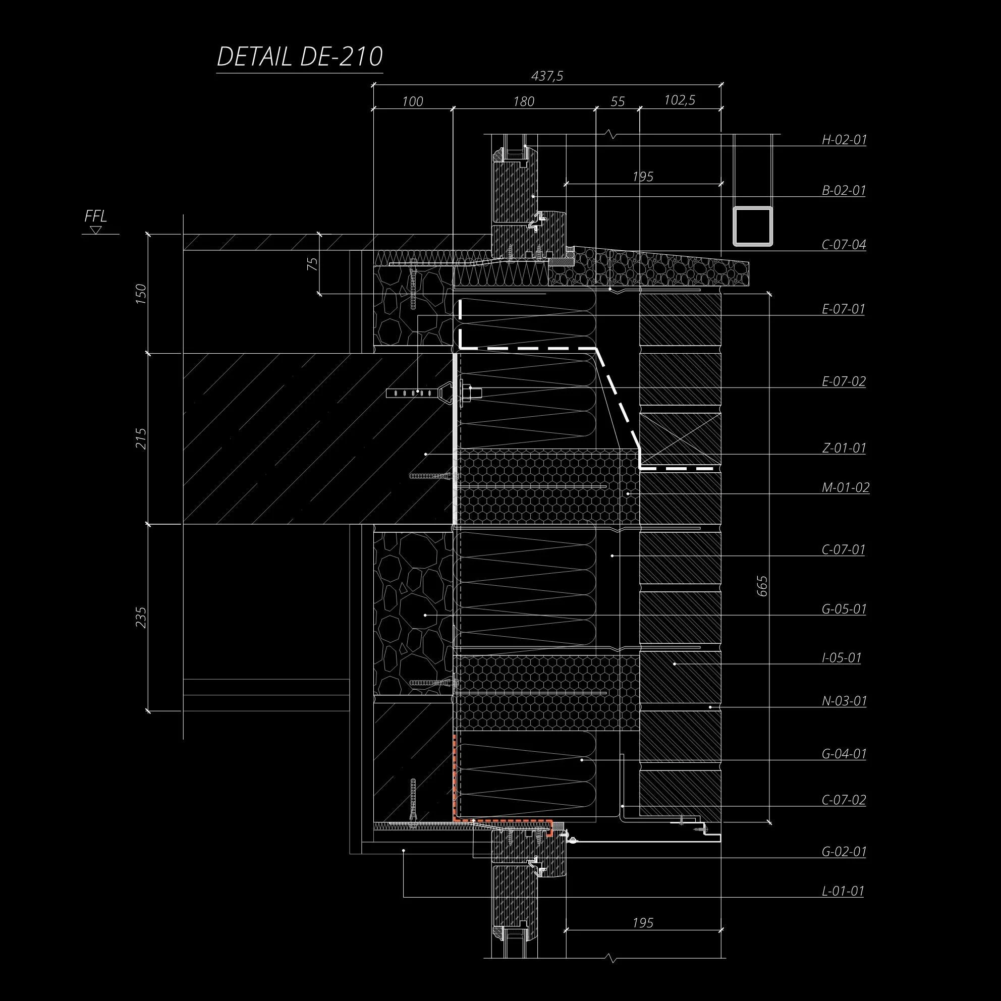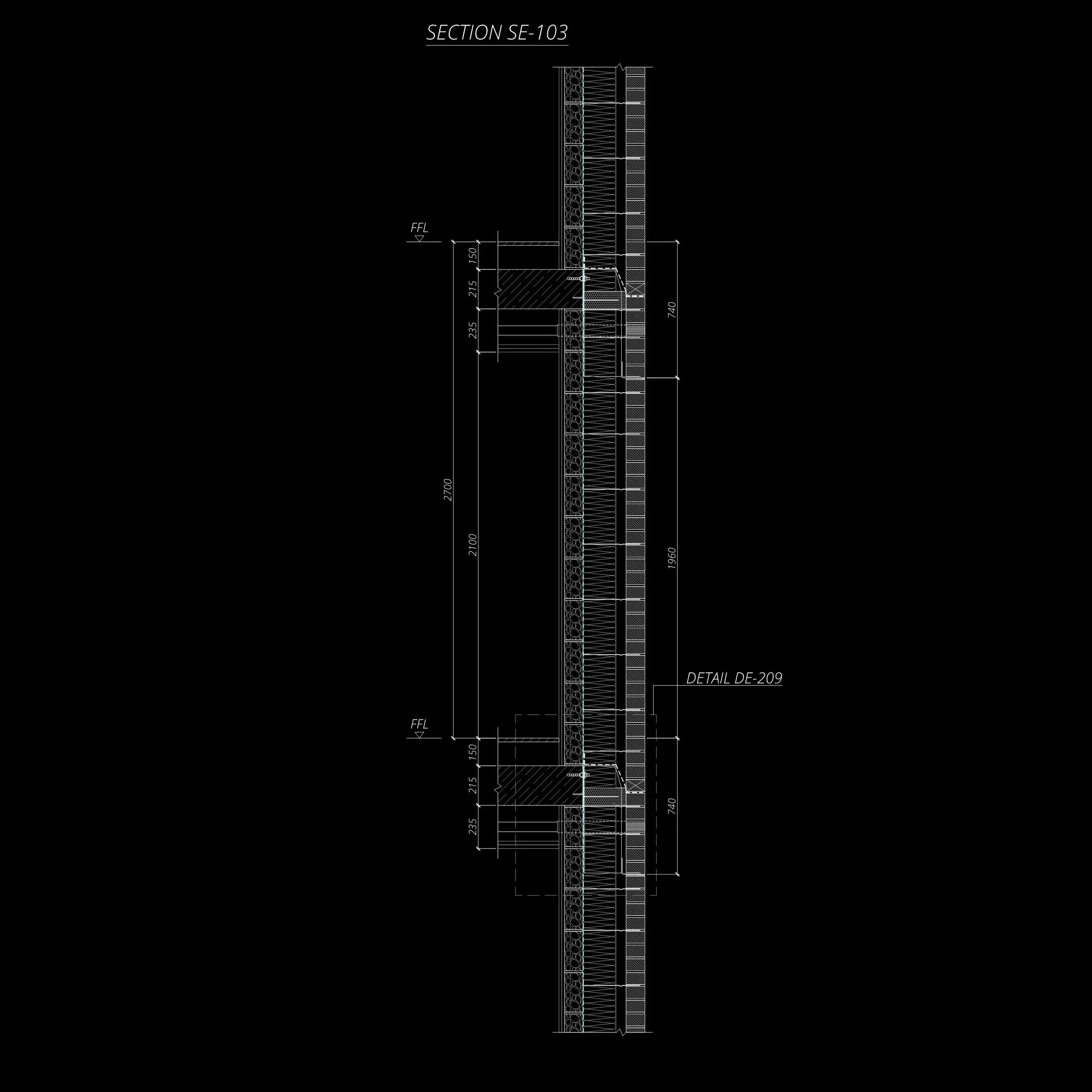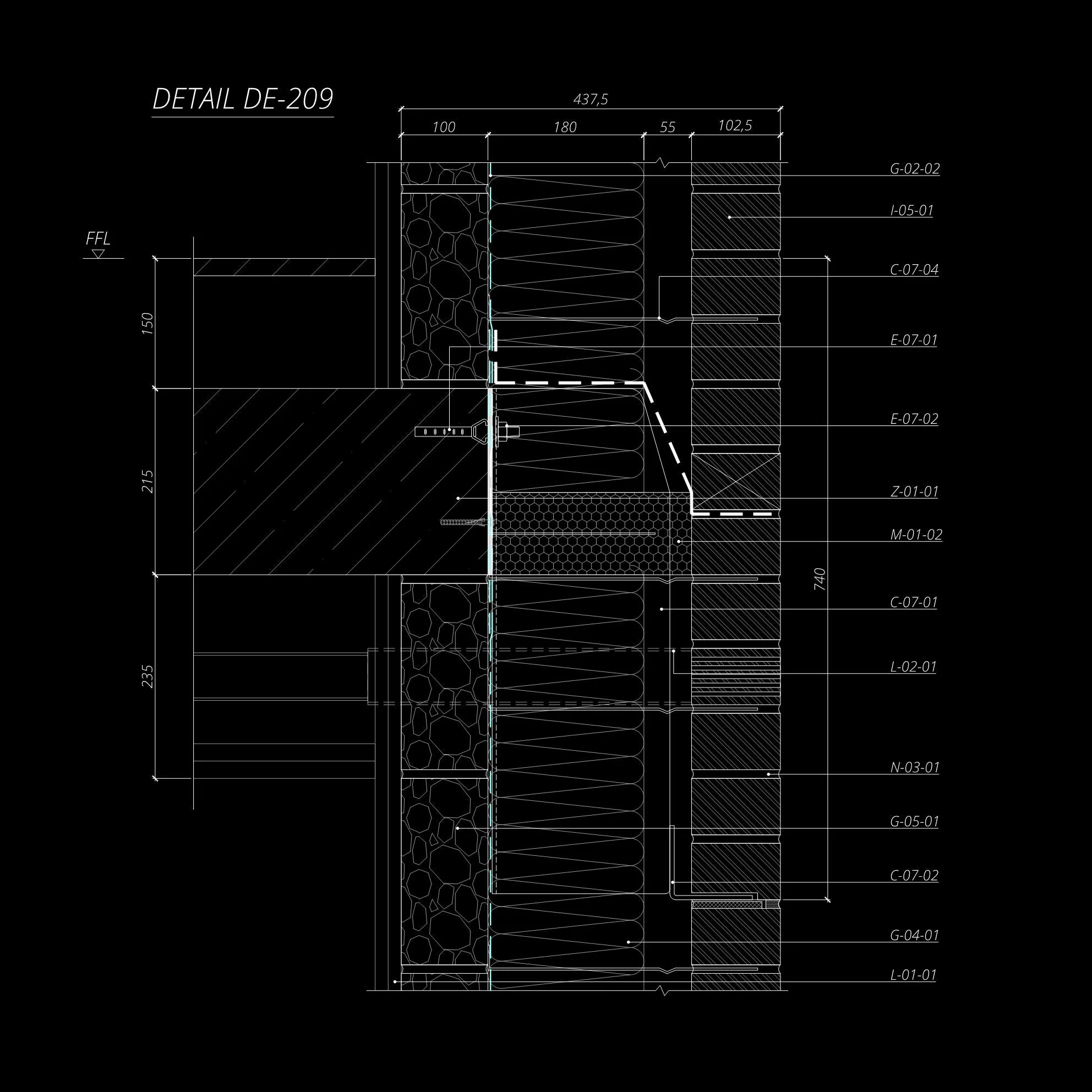 Architectural detail drawing of a wall section labeled "DETAIL DE-209" showing layers, dimensions, and materials in cross-section with annotations on a black background.