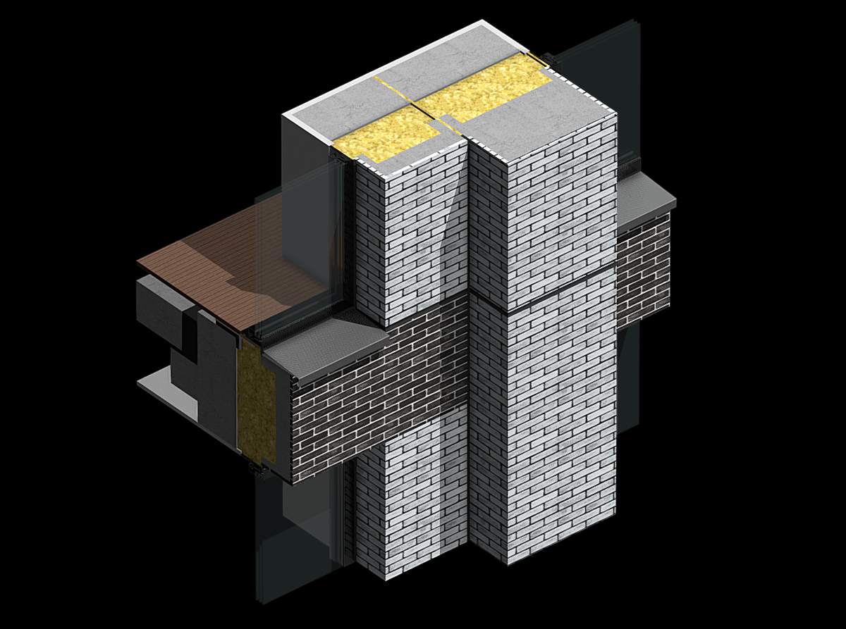 This course looks at rainscreen façade with punched openings and brick veneers. The façade has storey-height openings and feature protrusions with a layer of mechanically-fixed brick veneers installed on-site.